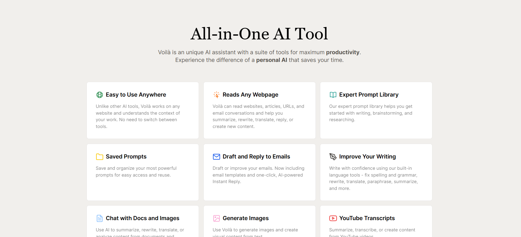Voilà AI fungiert als intelligenter Assistent, der Nutzer beim Schreiben, Recherchieren, Zusammenfassen und Organisieren ihrer Arbeit unterstützt. Da Voilà AI auf Browsern, Desktop-Computern und Mobilgeräten verfügbar ist, integriert es erstklassige KI-Tools nahtlos in Ihren Arbeitsalltag und steigert so Ihre Produktivität – unabhängig von Ihrem Arbeitsplatz.