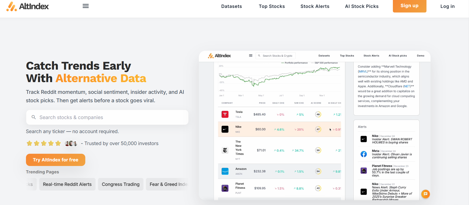 AltIndex is a stock research tool that focuses on real-world and online activity data. It helps investors notice trends and changes that may not appear in financial reports alone. This makes it useful for understanding how people react to companies in real time.