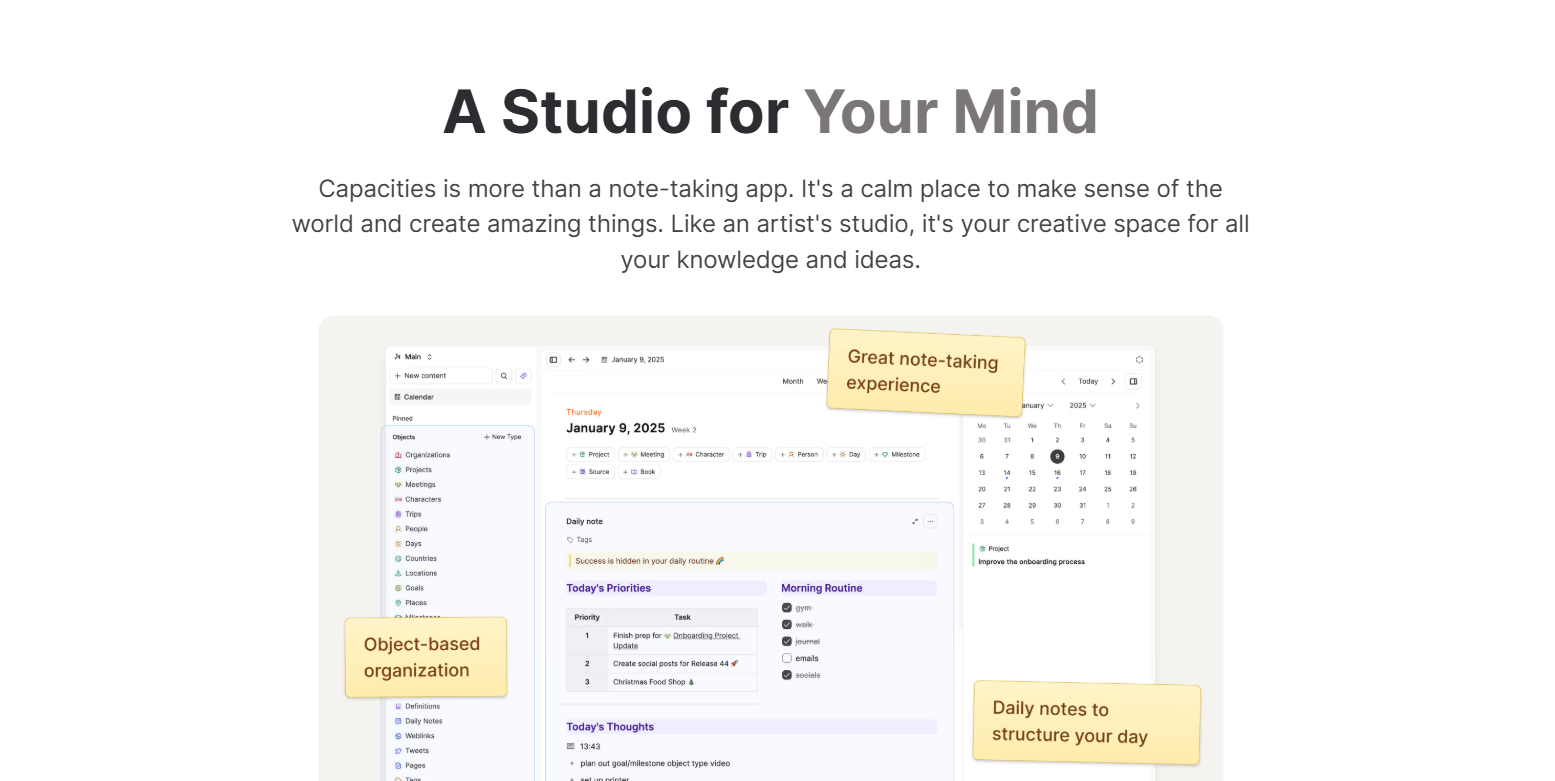 Unlock your mind with Capacities, where notes, tasks, and creativity come together effortlessly.