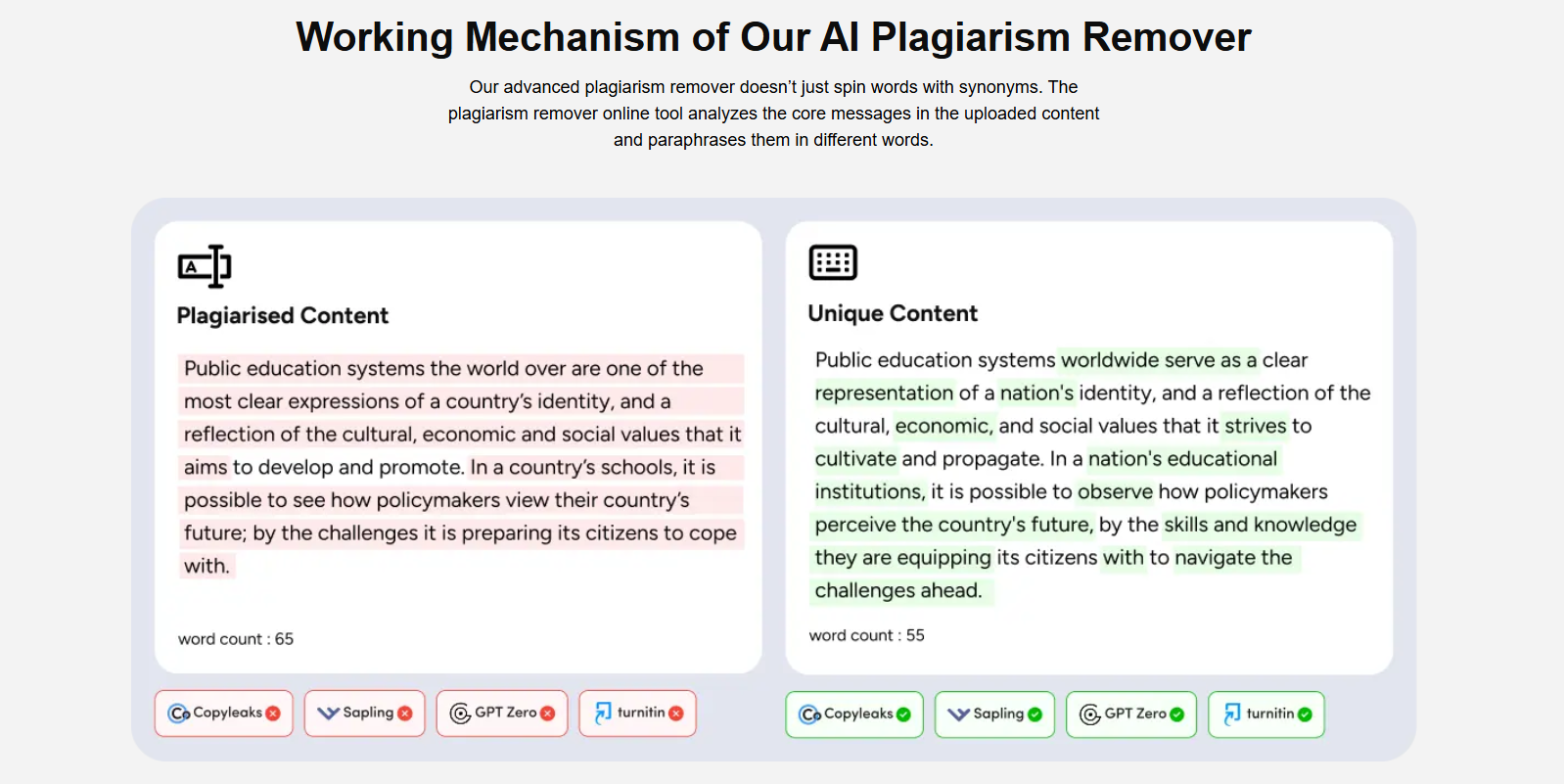 Effectively removes plagiarism without distorting the message.