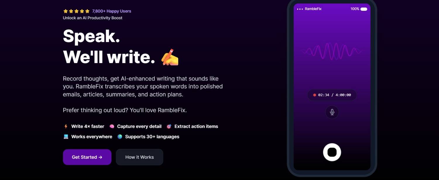 RambleFix is an AI tool that listens to your voice and writes out your thoughts in clear, neat text. All you have to do is speak naturally or upload an audio recording, and it rapidly translates that into a polished text that could be an email, article, note, or list.