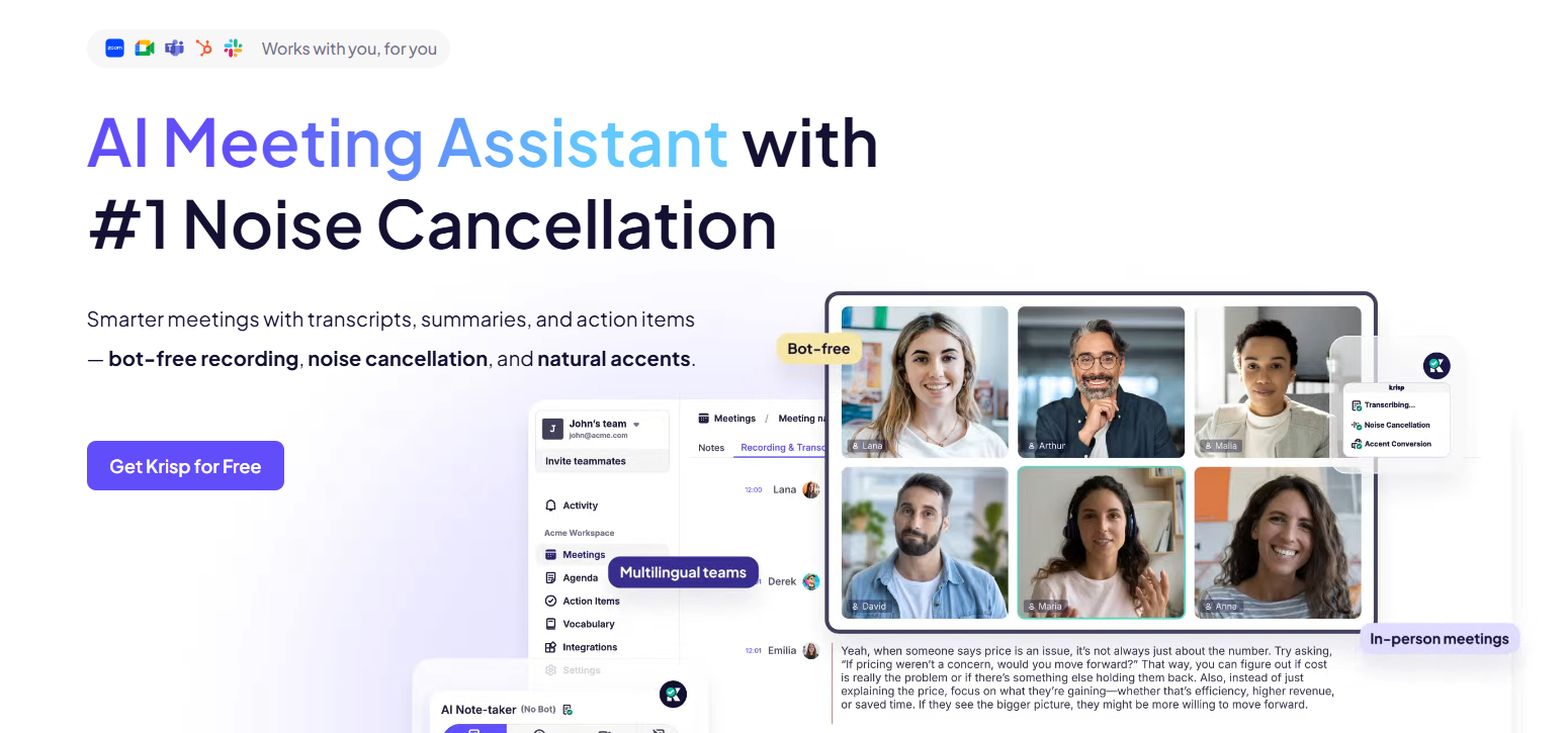 Krisp AI on yksi yksinkertaisimmista mutta tehokkaimmista työkaluista puheluiden laadun parantamiseen. Sen melunpoisto- ja äänenparannusominaisuudet toimivat välittömästi, mikä tekee siitä loistavan valinnan etätyöntekijöille, verkko-opettajille ja tiimeille.