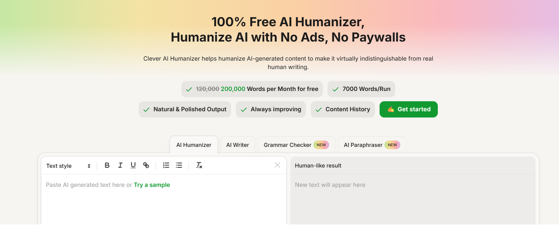 Clever Humanizer AI gratis untuk penggunaan umum, yang membuatnya menarik dibandingkan dengan banyak alat AI lainnya yang memerlukan pembayaran atau langganan.