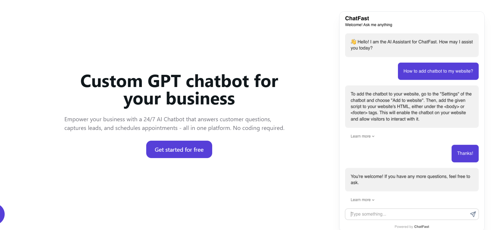 ChatFast adalah platform chatbot AI yang dirancang untuk mengotomatiskan komunikasi bisnis, membantu menghemat waktu, dan menarik lebih banyak pengguna dengan cara interaksi yang menarik. Didukung oleh fitur-fitur yang sesuai dan rencana harga yang dapat disesuaikan, ini adalah langkah cerdas bagi perusahaan mana pun yang membutuhkan otomatisasi percakapan yang terorganisir dengan baik dan mudah diperluas.
