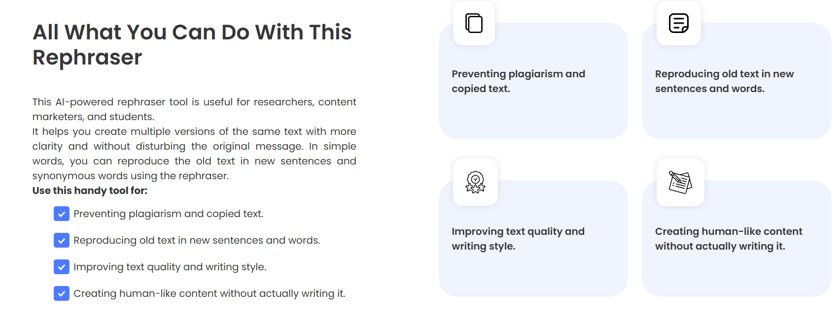 Rephraser vereenvoudigt het proces van het verbeteren van je teksten en transformeert ruwe concepten in gepolijste content. Het zorgt ervoor dat je content origineel blijft en bespaart je tegelijkertijd tijd. Het kan gebruikt worden voor