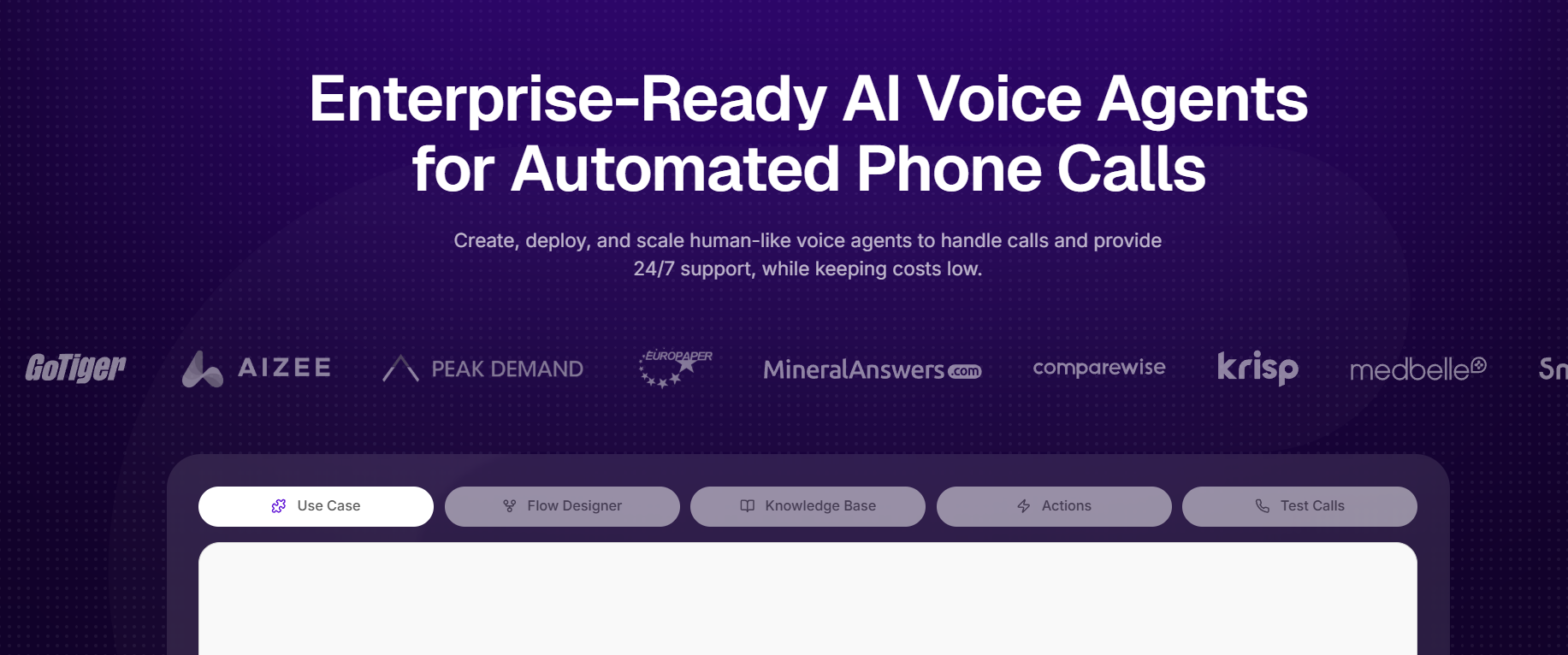 Конструктор без необходимости кодирования, интеллектуальные интеграции и практически человеческие голосовые ответы идеально подходят для компаний, стремящихся автоматизировать коммуникацию, сохраняя при этом человеческий фактор. Компания по-прежнему является лидером в нише голосового ИИ благодаря своей высокой производительности и стабильности, хотя её цена и возможности настройки могли бы быть улучшены.