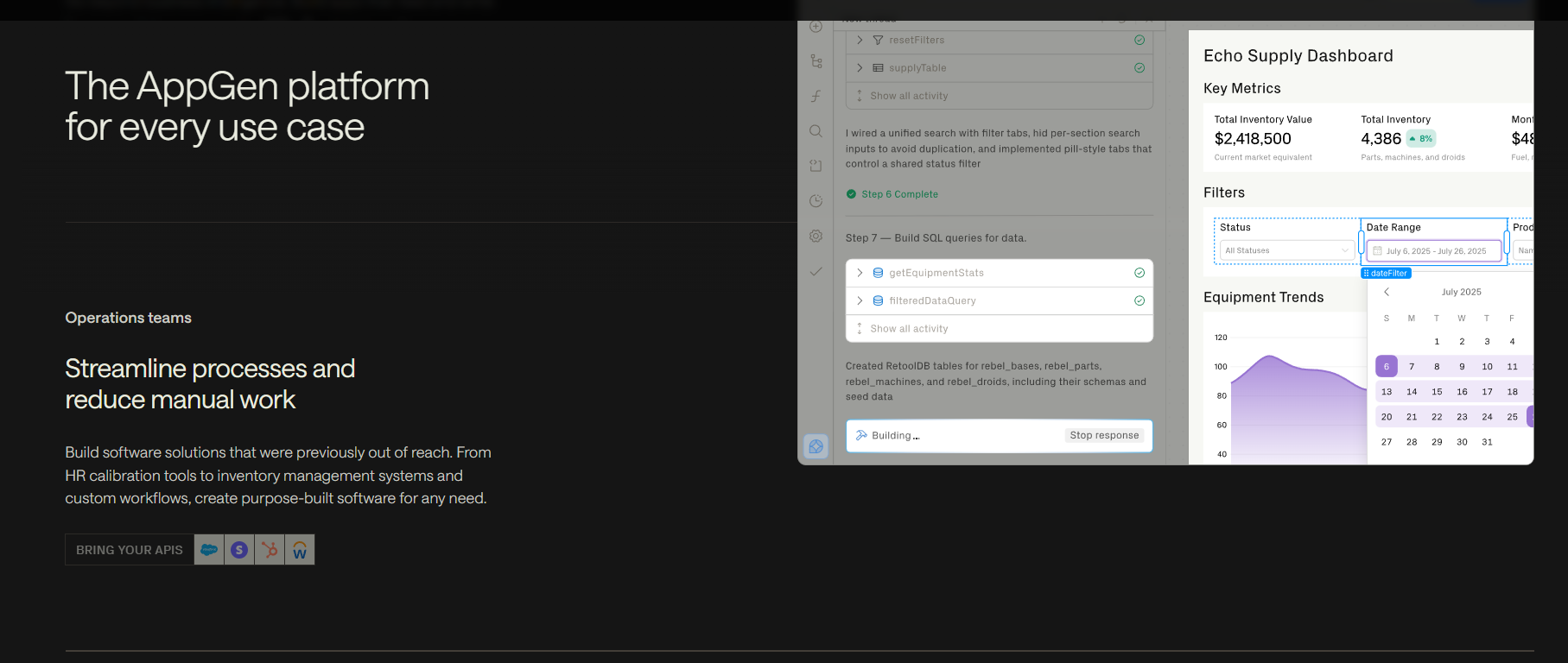 Dahili yapay zeka asistanı, metin komutlarından yola çıkarak uygulamalar oluşturabilir veya güncelleyebilir. Platform içinde arayüz öğeleri, sorgular ve temel mantık üretir.